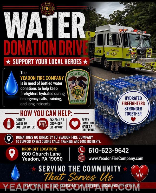 The Yeadon Fire Company is in need of bottled water donations to help keep firefighters hydrated during emergency calls, training, and long incidents.
